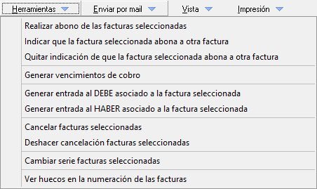 Desde esta pantalla dispondrá de una serie de herramientas de aplicación sobre las facturas, podrá enviar por e-mail o imprimir tanto el listado actual como las facturas que seleccione.