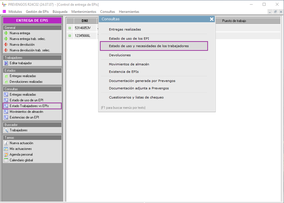 Para consultar el estado de uso de los EPIs y las necesidades de los trabajadores, habrá que dirigirse a la pantalla principal del módulo de EPIs para usar el menú Consultas > Estado de uso y necesidades de los trabajadores o bien seleccionar el acceso directo del panel lateral izquierdo Estado Trabajadores vs EPIs.