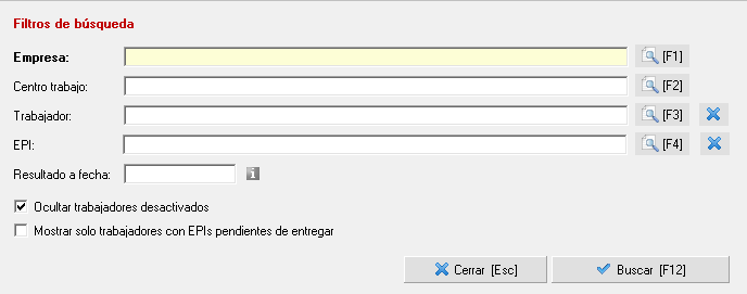 Una vez abierta la consulta accederemos a introducir los filtros deseados de empresa, centro, trabajador o epi, siendo obligatorio el primero de ellos. En relación a las dos últimas marcas del filtrado, por defecto se ocultarán aquellos trabajadores que estén desactivados y se mostrarán solamente los trabajadores que tengan entregas programadas (no confirmadas).