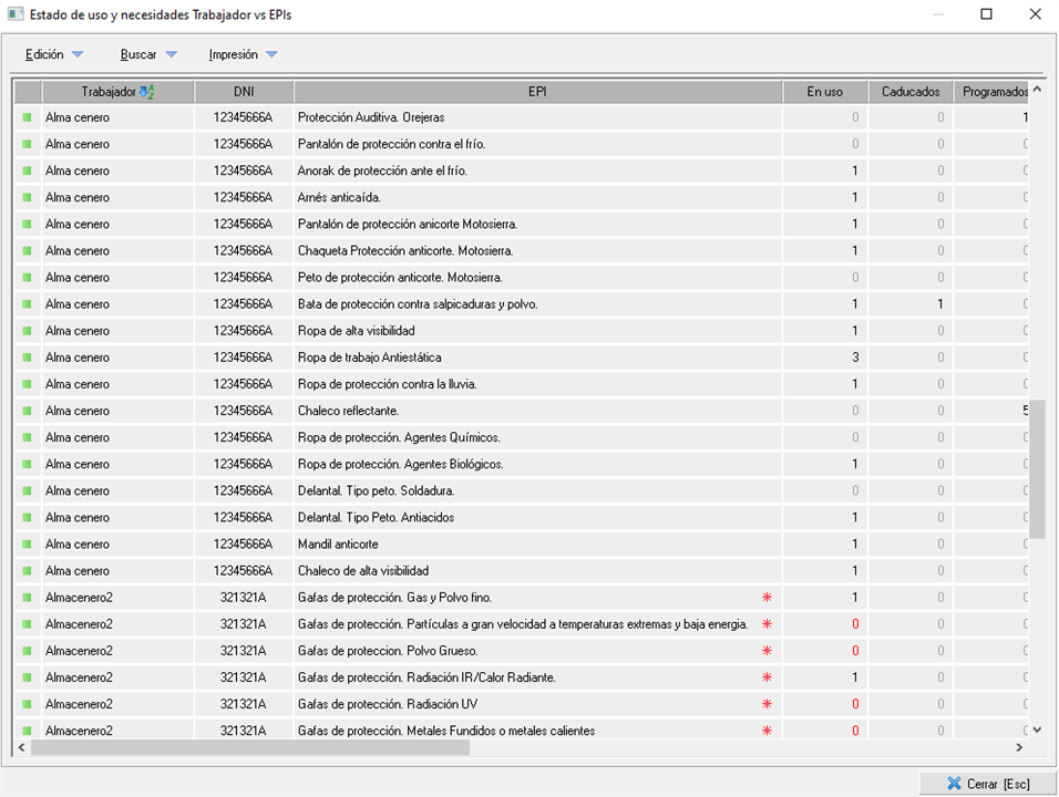 identifica aquellos EPIs que los trabajadores necesitan, por lo que el número 0 aparecerá en rojo para detectar que el trabajador necesita el EPI y no tiene ninguno en uso.