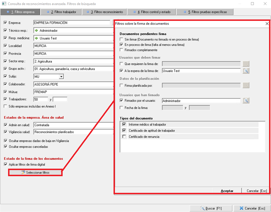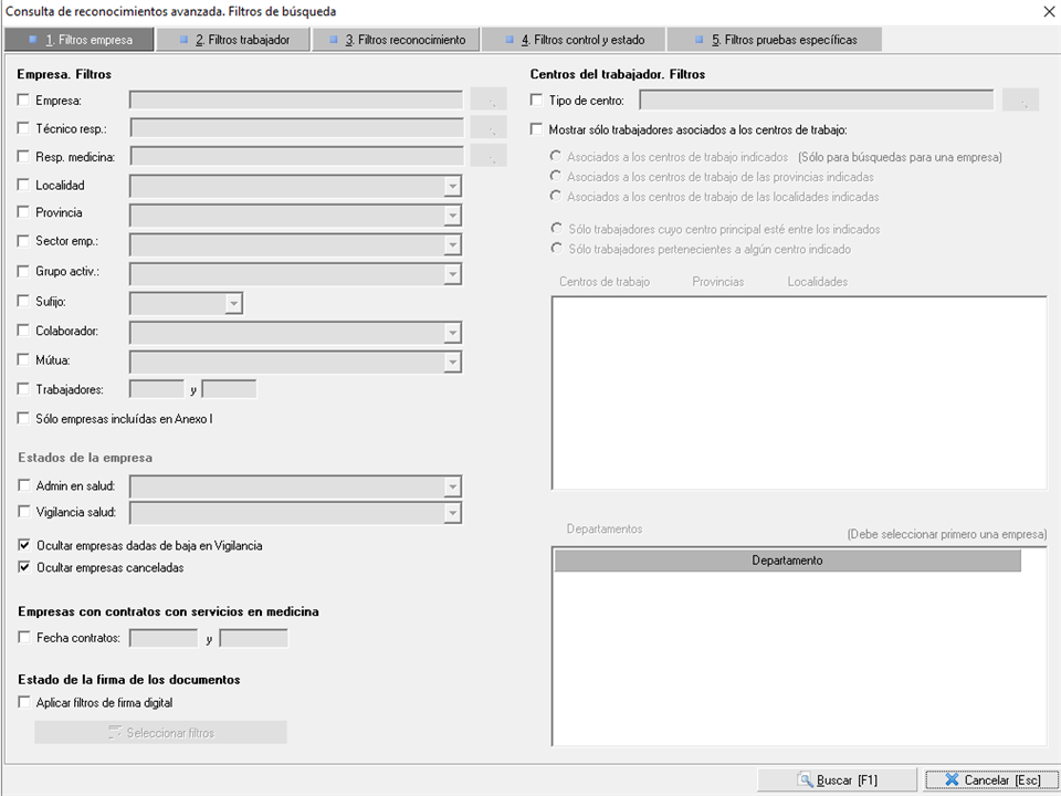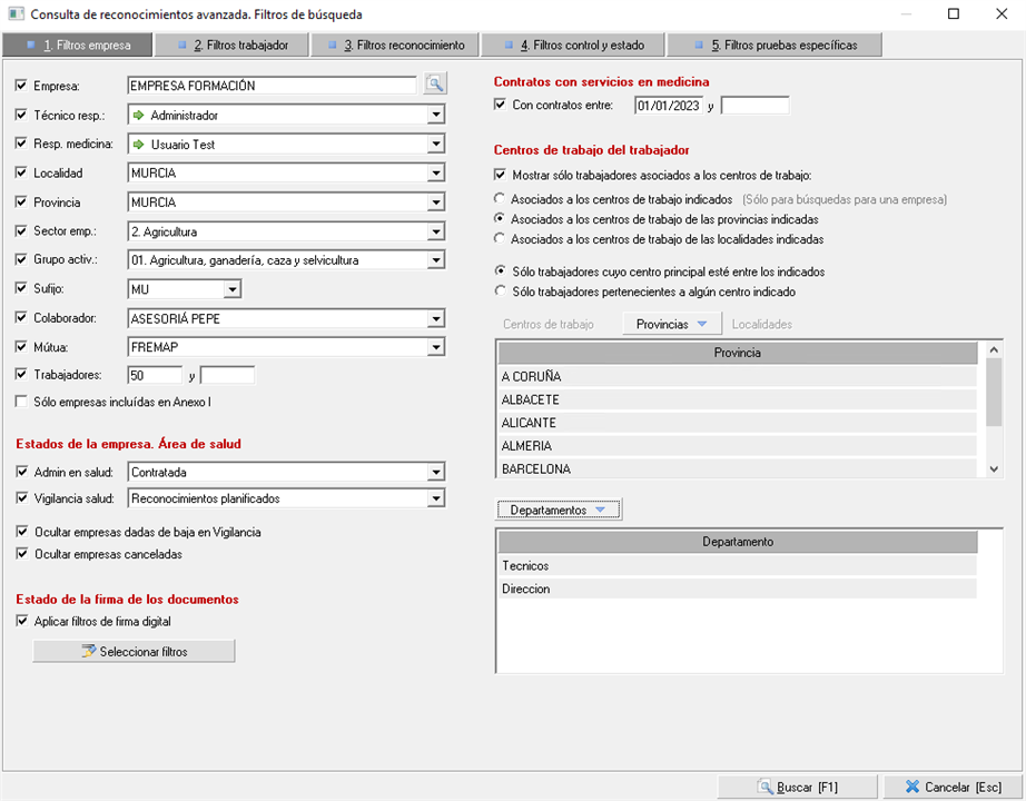 Dispone de opciones de filtrado referentes a datos de la empresa. Puede filtrar por una empresa en concreto o si no, por aquellas empresas de las que se responsabiliza un usuario, ya sea como técnico responsable o un como responsable de medicina, según la ubicación de la empresa, el sector y grupo de actividad, el número de trabajadores de los que se compone, etc.