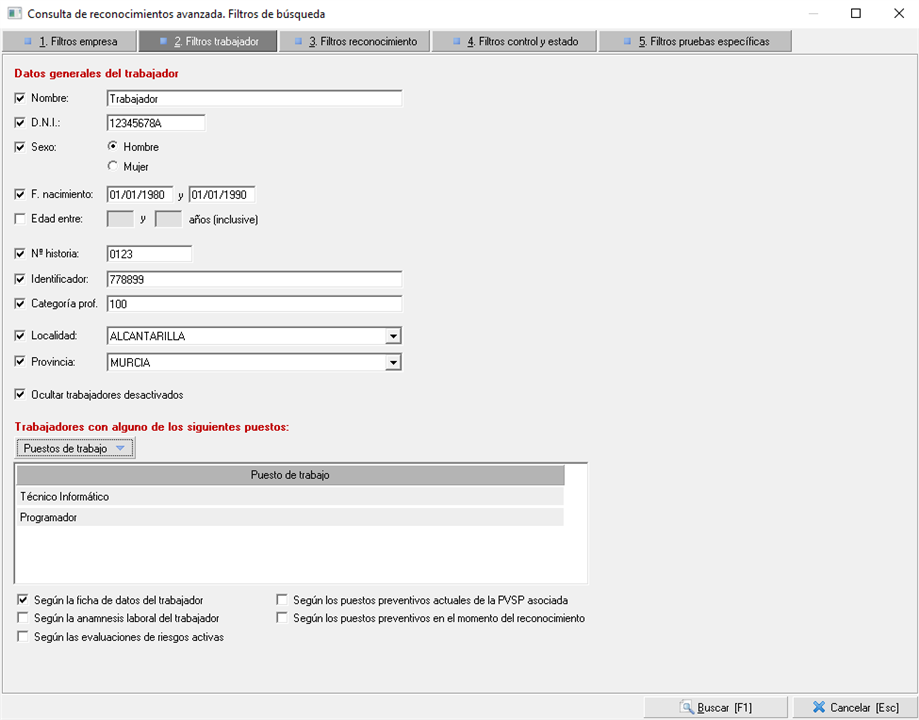 Por defecto, en estas opciones de filtrado siempre se comprobará el puesto de trabajo desde la ficha de los trabajadores, que corresponde al puesto administrativo. Sin embargo, se puede elegir que se compruebe según la anamnesis laboral del trabajador, los puestos preventivos (puestos evaluados donde se haya relacionado al trabajador), los puestos preventivos actuales de la PVSP a los que está asociado el trabajador o los puestos preventivos en el momento del reconocimiento.