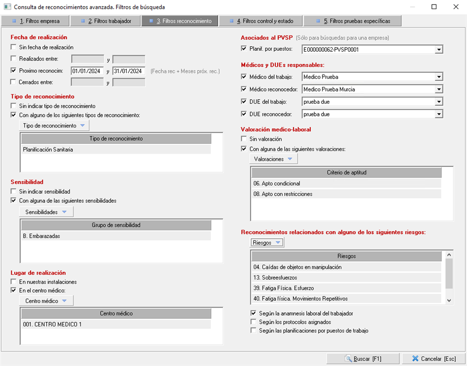 8. Reconocimientos relacionados con alguno de los siguientes riesgos, que por defecto serán aquellos que se han especificado en la anamnesis laboral hecha al trabajador, aunque puede modificarlo para que se comprueben los riesgos según los protocolos asignados al reconocimiento o los riesgos indicados en la PVSP.