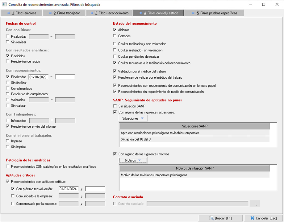 Al abrir la consulta y seleccionar esta pestaña se le muestran seis bloques de filtros relativos a los reconocimientos que se exponen a continuación. Todos ellos están dirigidos a mostrar aquellos reconocimientos médicos sobre los que se ha establecido un seguimiento por medio de fechas de control o aquellos que se deben revisar, ya sea porque se hayan identificado aptitudes no puras o críticas entre otros motivos.