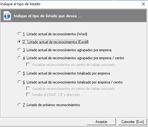 Listado actual. Con esta opción se podrá generar un informe con el listado actual de reconocimientos. Este informe se generará, por defecto, en un documento excel. Sin embargo, si lo prefiere tiene otras opciones de impresión en las que puede imprimir el listado en word, o agrupar el listado de excel por empresas, por empresa y centro, o bien totalizarlo por empresa o por empresa y centro. Con la última opción ("Listado de próximos reconocimientos"), se podrá generar en word un listado de trabajadores que incluye una columna de próximo reconocimiento NOTA: esta columna aparecerá con "--" si no se ha indicado la fecha del reconocimiento ya que no se podrá calcular.