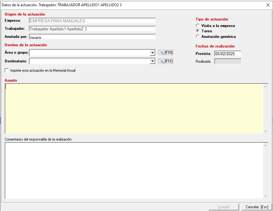 Si se selecciona uno de los reconocimientos de la lista se podrán consultar las actuaciones que se le hubieran asociado o crear una nueva actuación sobre el mismo. Al crear una nueva actuación se abrirá una pequeña ventana, como la que se muestra a continuación, donde se podrán introducir los datos de la misma (área o grupo, destinatario, tipo de actuación y fecha), su asunto y, si fuera necesario, se podrán hacer observaciones o comentarios por la persona que anota dicha actuación.
