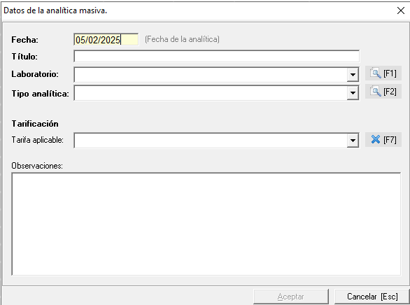 Se podrán crear análiticas de forma masiva para los reconocimientos médicos seleccionados. Al seleccionar esta opción se abrirá una ventana donde se podrán indicar los datos de la analítica, como se muestra en la siguiente imagen. Por defecto, la fecha de la analítica será la del día en la que se crea la misma, pudiendo ser modificada si así se desea.