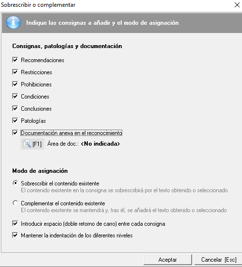 También se podrán asignar consignas automatizadas a varios trabajadores de forma masiva. En este caso se abrirá una nueva ventana donde se podrán marcar las consignas que se deseen añadir (se podrán seleccionar recomendaciones, restricciones, prohibiciones, condiciones, conclusiones, patologías y documentación anexa en el reconocimiento). Se podrá optar entre dos modos de asignación: complementar el contenido existente en la consigna o sobrescribirlo.