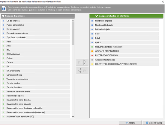 Resultados de los reconocimientos (listado actual). Con esta opción se puede generar el detalle de los reconocimientos del listado de trabajadores consultado. En este informe se podrán seleccionar aquellos campos que se quieran incluir (resultados del reconocimiento, resultados de las exploraciones físicas o complementarias, datos de la historia clínica y resultados de las pruebas analíticas). Los distintos campos que se añadan serán columnas del Excel que se genere.