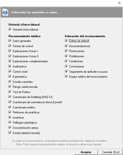 Copiar último reconocimiento realizado (seleccionados). Si se seleccionan uno o varios trabajadores de la lista se podrá usar la herramienta "Copiar último reconocimiento realizado (seleccionados)", de manera que a cada uno de los trabajadores seleccionados se le copiara su último reconocimiento médico. No obstante, cuando no interese copiar todos los apartados del último reconocimiento médico, se podrán marcar solo aquellos que nos interesen: