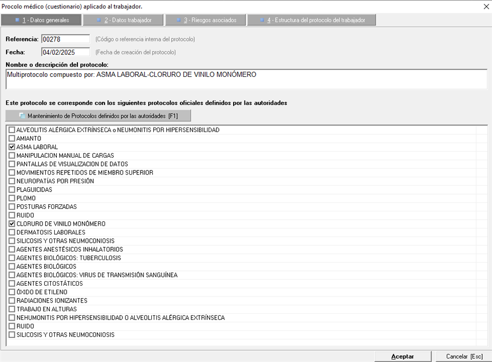 Añadir protocolos. Una vez seleccionado un trabajador de la lista, si accedemos al menú "Reconocimientos">"Herramientas">"Protocolos médicos">"Añadir protocolos", se abrirá la pantalla del mantenimiento de protocolos y se le podrán asignar los protocolos que correspondan. Hay que tener en cuenta que aparerán en negrita aquellos protocolos cuyos riesgos asoaciados coinciden con los riesgos que se hubieran identificado al trabajador en las evaluaciones de riesgo activas o que se hubieran determinado en las relaciones predefinidas del mantenimiento del puesto de trabajo.