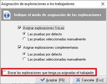 Se podrán asignar exploraciones físicas y complementarias. Las pruebas podrán seleccionarse manualmente o bien se asignarán aquellas que estuvieran establecidas por defecto. Además, existe la opción de borrar las exploraciones que ya tuviera asignadas el trabajador, como se puede apreciar en la siguiente imagen.