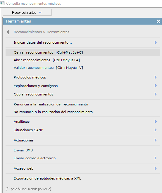 - [F1] Búsqueda de menús por texto. Una vez desplegado el menú 'Reconocimientos', si pulsa sobre su teclado [F1] podrá buscar rápidamente la opción que necesite, escribiendo el texto, sin necesidad de ir abriendo pestañas.