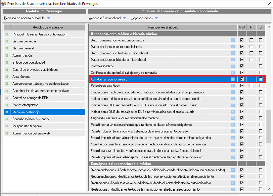 Los reconocimientos médicos se podrán cerrar o abrir de forma masiva por aquellos usuarios que tuvieran permisos para ello. El permiso para abrir y cerrar reconocimientos médicos lo podemos encontrar, dentro de la ficha del usuario de Prevengos, en el área referida a Medicina del trabajo: