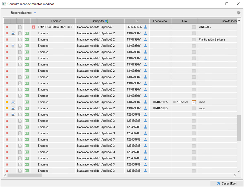 La primera columna insertará un cuadrado de distinto color o una exclamación roja en función de cómo se encuentra el reconocimiento del trabajador: