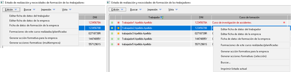 - La segunda columna indica el estado de la formación, siendo rojo cuando es requerida y no está realizada, verde cuando la formación está realizada y naranja cuando la formación finalizó sin haber sido realizada (el trabajador estaba incluido en la misma pero marcado como "no ha asistido")