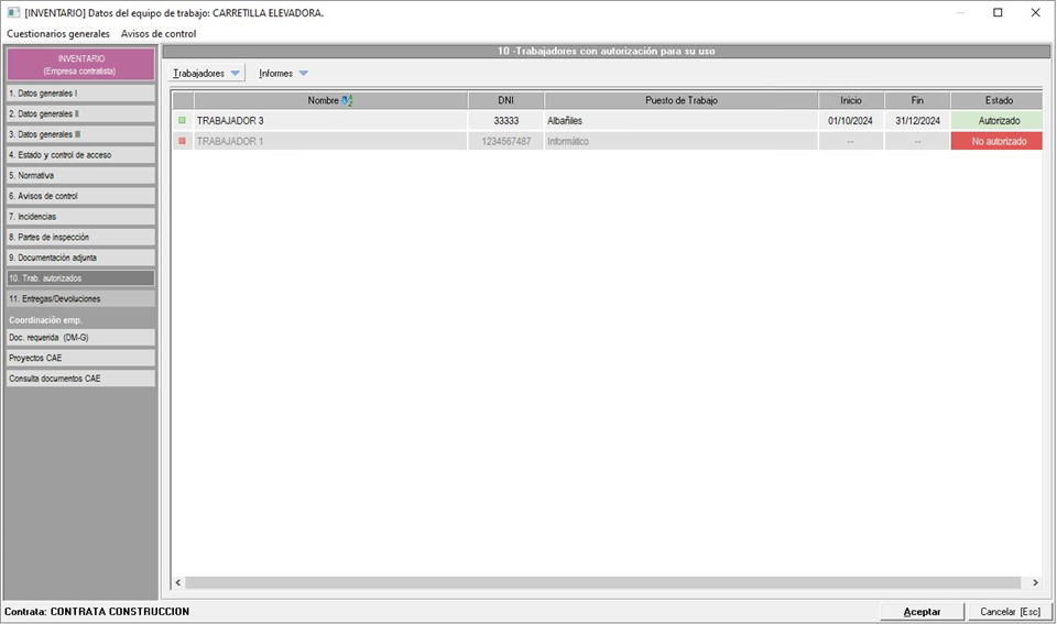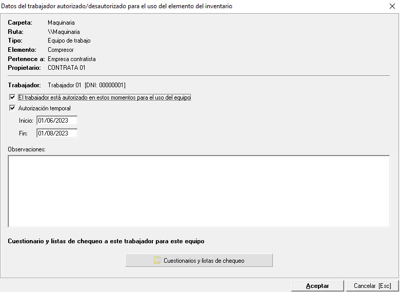 En el caso de que en el inventario se incluyan máquinas o equipos de trabajo que requieran de una autorización específica para poder ser usados, en este apartado podrán añadir a los trabajadores que podrán usar estos equipos. La pestaña tiene un aspecto similar a la siguiente imagen: