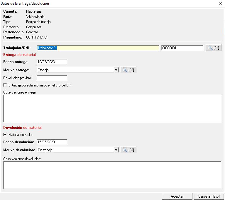 Si se realiza devolución del equipo, en la misma ficha de la entrega, se podrán indicar los datos de la devolución, donde como mínimo tendrán que indicar la fecha y el motivo de devolución.