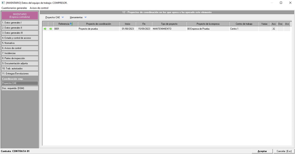 Dado que esta ventana es la misma que se usa cuando actualizamos los requerimientos dentro de un proyecto CAE, podemos apreciar que aparecen estas opciones orientadas a los proyectos, pero dado que estamos en la ficha del inventario desde el mantenimiento de contratas, están deshabilitadas.