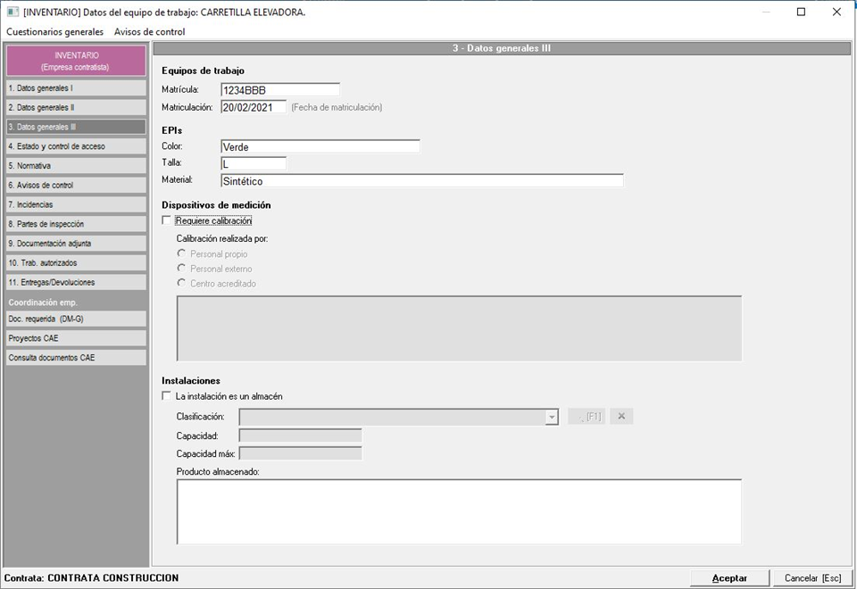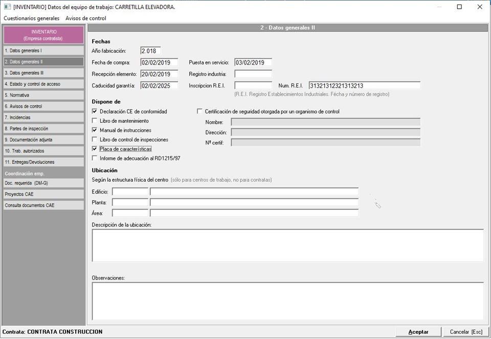 Dentro de esta pestaña añadiremos información en función del tipo de elemento. Al principio de este manual indicábamos que al añadir el inventario podía ser un equipo de trabajo, un EPI, un dispositivo de medición o una instalación. Dentro de este apartado podemos indicar información específica para cada uno de estos tipos, en una ventana similar a la siguiente imagen: