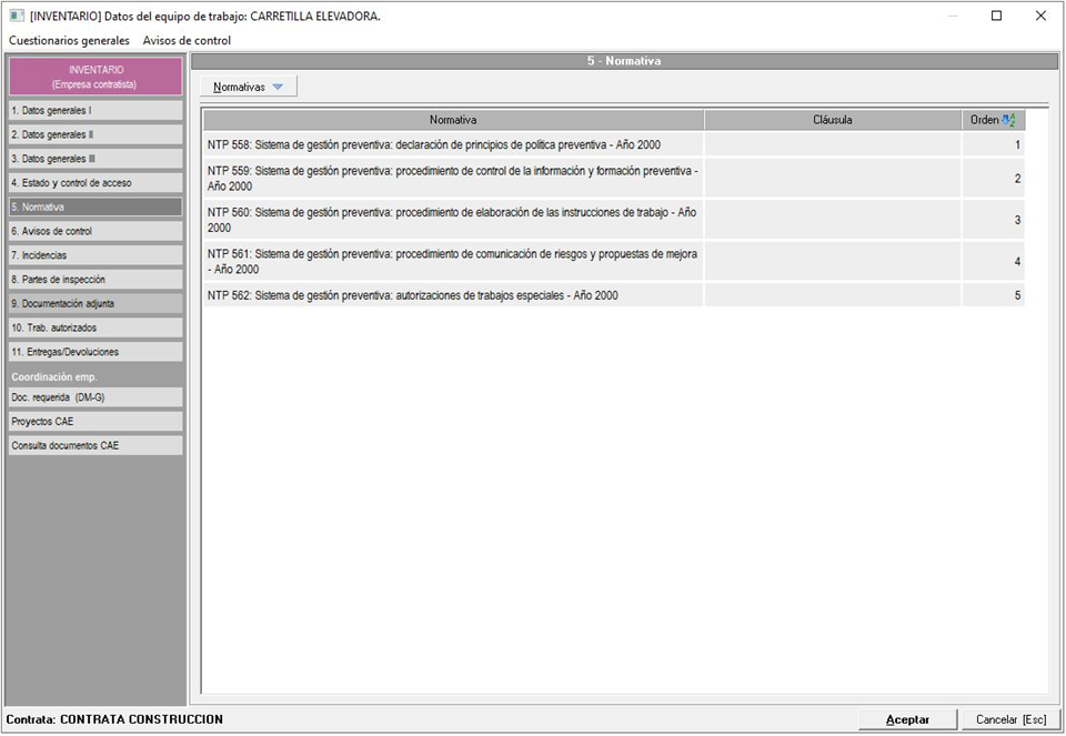 En este apartado podrán incorporar la normativa vigente relacionada con el equipo de trabajo, en una pantalla similar a la siguiente imagen: