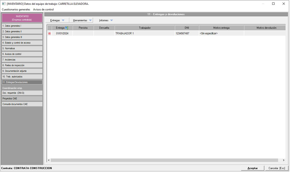 Desde este apartado podrán gestionar entregas y devoluciones de los equipos a trabajadores, en una pantalla similar a la siguiente imagen: