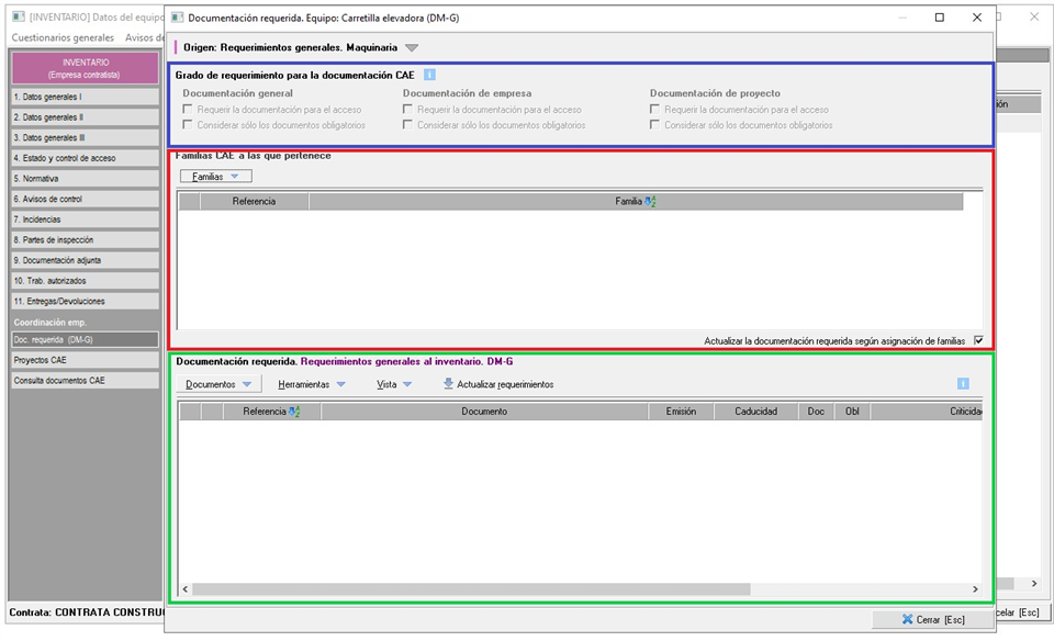 Por último encontramos el bloque orientado a la Documentación general de la máquina (DM-G), bloque que hemos resaltado con un recuadro de color verde. Aquí tendremos un listado de los documentos que se le requieren al inventario, los cuales pueden estar asignados por: