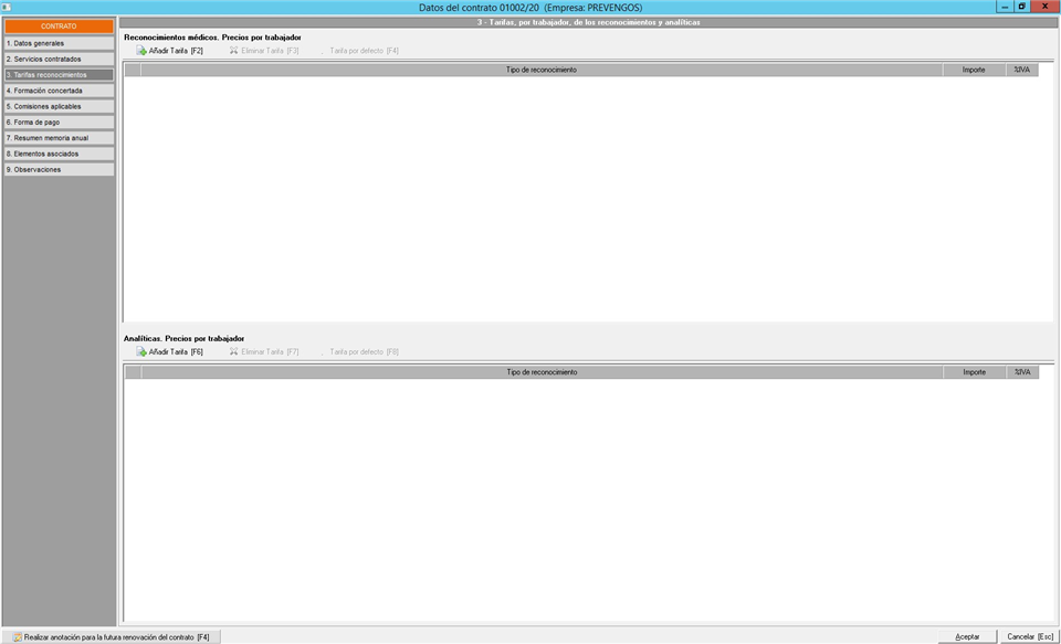 En el apartado anterior 'Servicios Contratados' se indican los servicios incluidos y los importes para cada uno de los servicios. Estos son importes fijos del contrato, los cuales se facturarán al cliente según la forma de pago acordada con el mismo. Pero existe la posibilidad de que una parte de la Vigilancia de la Salud se cobre en función de los reconocimientos o analíticas realizadas, ya sea porque exceden de los servicios incluidos en el contrato o porque se ha acordado con el cliente que estos servicios se facturen en función de lo que se realice. En este apartado vamos a indicar los precios o tarifas acordadas con el cliente para este tipo de servicios.