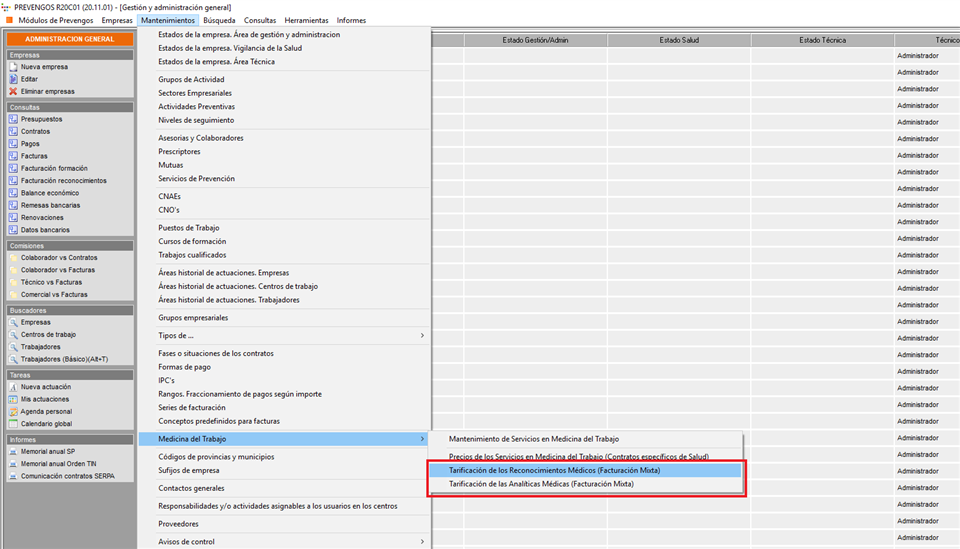 Tanto las tarifas de reconocimientos médicos como las de analíticas, se configuran en un mantenimiento, al que tenemos acceso desde la de la pantalla principal del módulo de Administración desplegando el menú ‘Mantenimientos ' y el submenú 'Medicina del Trabajo’, como vemos en la siguiente imagen.