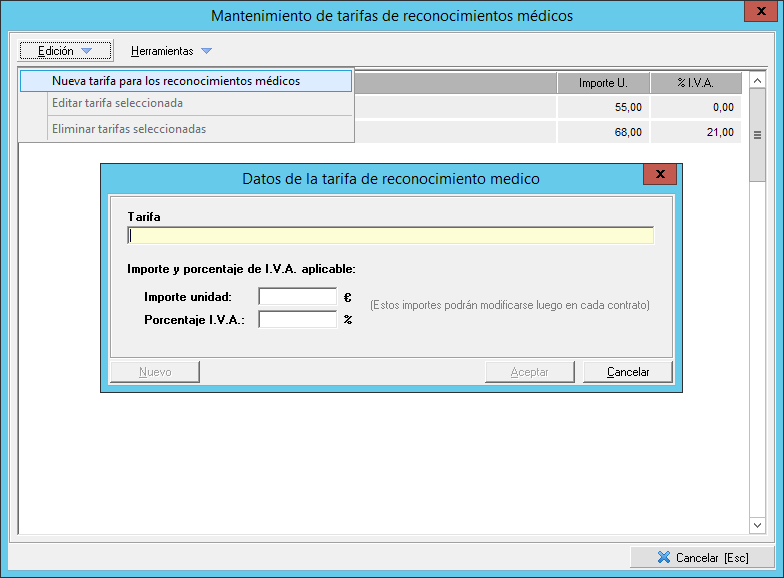 Una vez dentro del mantenimiento es muy sencillo dar de alta nuevas tarifas, basta con desplegar el menú 'Edición' y pulsar sobre la opción 'Nueva tarifa...' que nos llevará a un pequeño formulario donde podrán indicar el nombre de la tarifa, el importe y el I.V.A. aplicable a la misma. Tanto el importe como el I.V.A. podrán moficiarse en los contratos, en caso de que se negocien otras condiciones con el cliente.