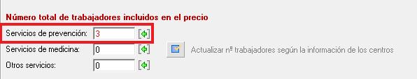 - Incluir el número de trabajadores concertados en prevención. Con esta opción, el programa grabará el número de trabajadores que se hayan indicado anteriormente en el apartado '2. Servicios contratados', en concreto en el campo 'Número total de trabajadores incluidos en el precio - Servicios de prevención'.