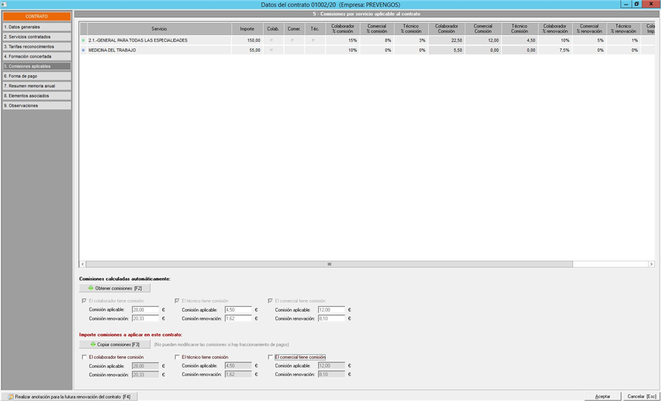 Como hemos indicado en el apartado anterior, si hacemos una configuración o asignación previa de comisiones, al crear el contrato estas comisiones se volcarán automáticamente a dicho contrato, no obstante, estas comisiones también podrán modificarse en el contrato, concretamente en el apartado '2. Servicios concertados'. Después de añadir los servicios, el usuario podrá editarlos y modificar el porcentaje de comisión tanto para la asesoría/colaborador, como para el técnico o el comercial.