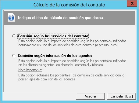 - Comisión según la información de los agentes. Comprobará la comisión definida en la configuración general, concretamente en el mantenimiento de asesorías y en la configuración de servicios predefinidos de los contratos. En este caso actualizará tanto el porcentaje indicado en los servicios del contrato como en los importes que se muestran en este apartado.