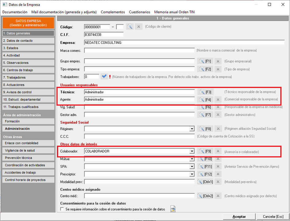 Una vez definidos los porcentajes de comisión para asesorías/colaboradores, técnicos y comerciales, tendrán que relacionar la empresa con el técnico, el comercial o el colaborador correspondiente a ese cliente. Esta relación la establecerán dentro de la ficha de la empresa, en el apartado de los datos generales como pueden observar en la siguiente imagen.