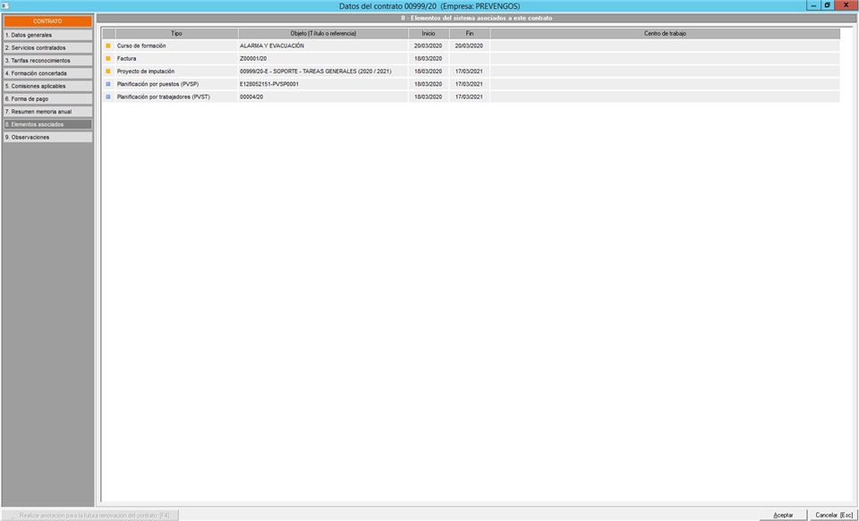 En Prevengos hay varios elementos que pueden estar relacionados a un contrato, y este está asociado a algún elemento no podrá eliminarse. Para que el usuario pueda identificar los elementos a los que está asociado el contrato, en esta pantalla se muestra el detalle de estos elementos. A continuación enumeramos toda la información que puede aparecer en esta pantalla.