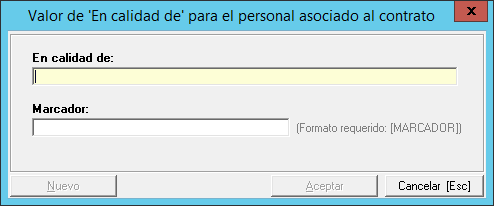 Para el registro del nuevo valor sólo es necesario indicar la nomenclatura en el campo "En calidad de" y el marcador para la plantilla de impresión del contrato en el formato "[TEXTO]"