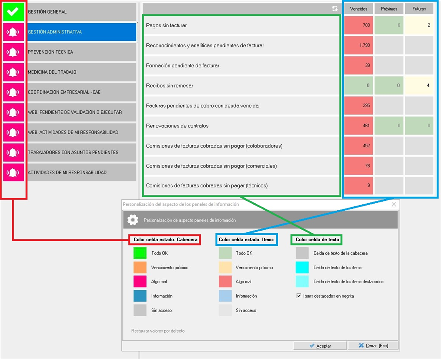 - Color celda estado. ítems. Para cada uno de los ítems podemos establecer un color diferente en función del estado del mismo, el cual puede ser Todo OK, vencimiento próximo, algo mal, información o sin acceso por parte del usuario