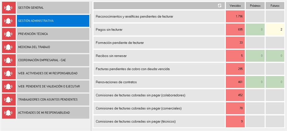 - GESTIÓN ADMINISTRATIVA. Pagos sin facturar, reconocimientos y analíticas pendientes de facturar, formación pendiente de facturar, recibos sin remesar, facturas pendientes de cobro con deuda vencida, renovaciones de contrato, comisiones de facturas cobradas sin pagar (colaboradores, comerciales y técnicos)