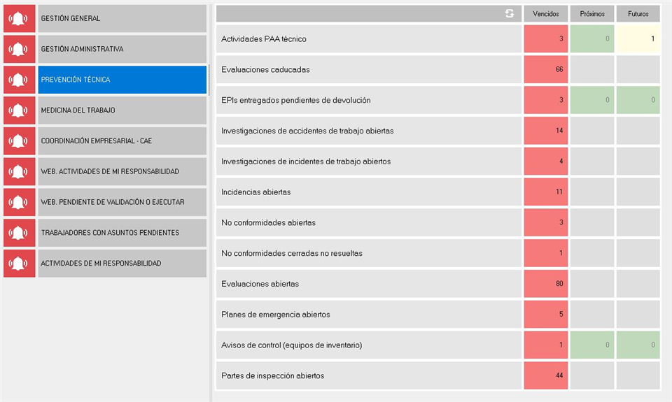 - PREVENCIÓN TÉCNICA. Actividades PAA técnico, evaluaciones caducadas, evaluaciones abiertas, planes de emergencia abiertos, EPIs entregados, investigaciones de accidentes/incidentes de trabajo abiertos, incidencias abiertas, no conformidades abiertas, no conformidades cerradas no resueltas, avisos de control (de equipos de inventario), partes de inspección abiertos.