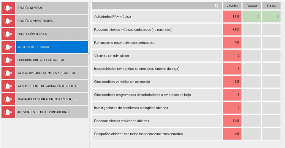 - MEDICINA DEL TRABAJO. Actividades PAA médico, reconocimientos médicos caducados (no renuncias), renuncias de reconocimientos caducadas, vacunas sin administrar, incapacidades temporales abiertas (actualmente de baja), citas médicas vencidas sin asistencia, citas médicas programadas de trabajadores o empresas de baja, investigaciones de accidentes biológicos abiertas, reconocimientos realizados abiertos y campañas abiertas con todos los reconocimientos cerrados
