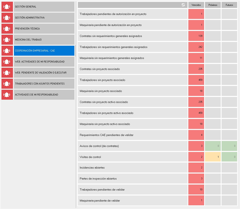 - COORDINACIÓN EMPRESARIAL - CAE. Trabajadores pendientes de autorización en proyecto, maquinaria pendiente de autorización en proyecto, contratas/trabajadores/maquinaria sin requerimientos generales, contratas/trabajadores/maquinaria sin proyecto asociado, contratas/trabajadores/maquinaria sin proyecto activo, requerimientos CAE pendientes de validar, avisos de control (de contratas), visitas de control, incidencias abiertas, partes de inspección abiertos, trabajadores pendientes de validar y maquinaria pendiente de validar