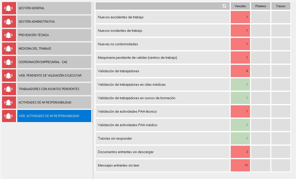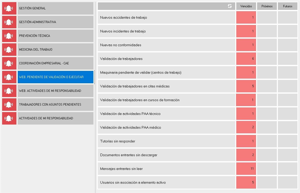 - WEB. PENDIENTE DE VALIDACIÓN O EJECUTAR. Nuevos accidentes de trabajo, nuevos incidentes de trabajo, nuevas no conformidades, maquinaria pendiente de validar, validación de trabajadores, validación de trabajadores en citas médicas, validación de trabajadores en cursos de formación, validación de actividades PAA médico y técnico, tutorías sin responder, documentos entrantes sin descargar, mensajes entrantes sin leer y usuarios sin asociación a elemento activo.