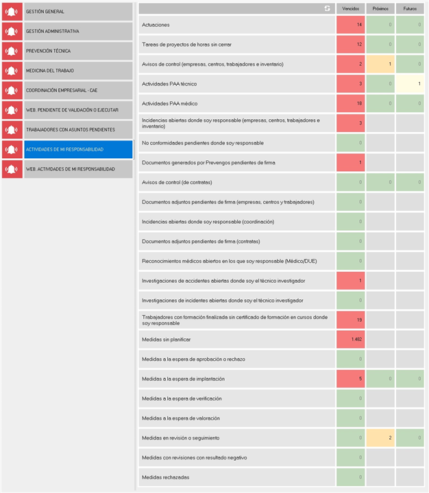 - ACTIVIDADES DE MI RESPONSABILIDAD. Actuaciones, tareas de proyectos de horas sin cerrar, avisos de control (empresas, centros, trabajadores e inventario), avisos de control (contratas), actividades PAA técnico y médico, investigaciones de accidentes/incidentes abiertas donde soy el técnico investigador, incidencias abiertas donde soy responsable (de empresa, centro, trabajador e inventario), incidencias abiertas donde soy responsable (coordinación), no conformidades pendientes donde soy responsable, trabajadores con formación finalizada sin certificado de formación en cursos donde soy responsable, documento generados por Prevengos pendientes de firma, documentos adjuntos pendientes de firma (empresas centros, trabajadores y, a parte, contratas), reconocimientos médicos abiertos en los que soy responsable (médico/DUE), medidas sin planificar, medidas a la espera de aprobación o rechazo, medidas a la espera de implantación/verificación/valoración/en seguimiento, medidas con revisiones con resultado negativo y medidas rechazadas.