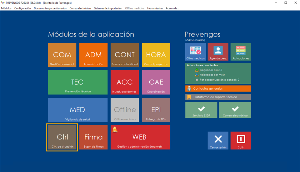 En este manual vamos a explicar la herramienta de Control de situación actual que tenemos disponible en la pantalla principal de Prevengos, en concreto el botón que vemos remarcado en la siguiente imagen: