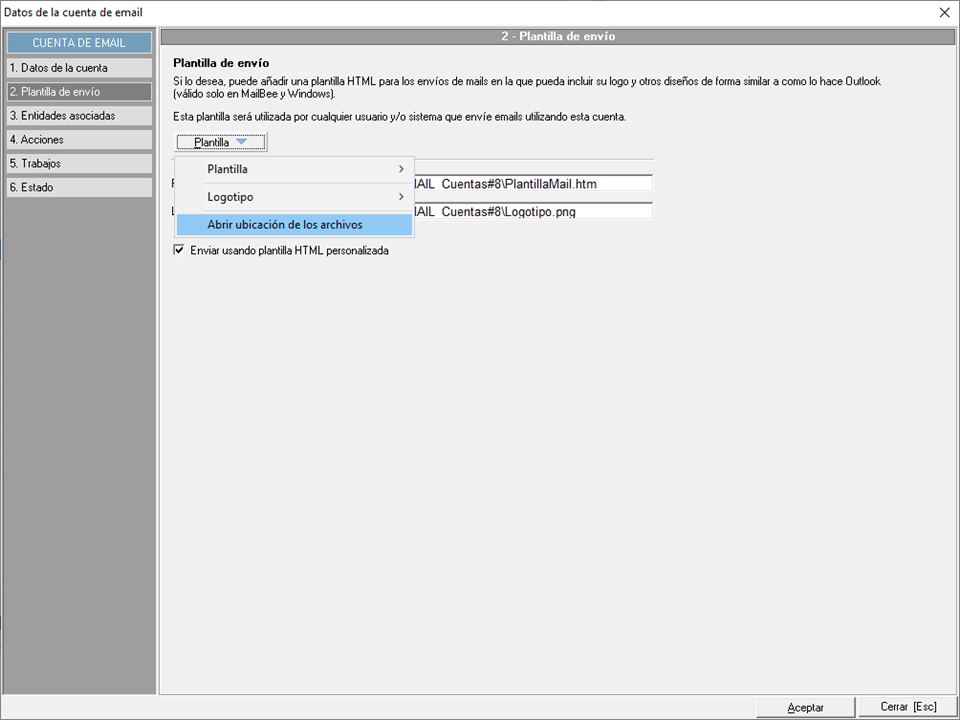 Permite, si desea usarlo en el envío de e-mails, cargar una firma de correo mediante una plantilla HTML y un logo con el menú Plantilla, tal y como se explica en la guía Configuración firma HTML para el envío de e-mails.
