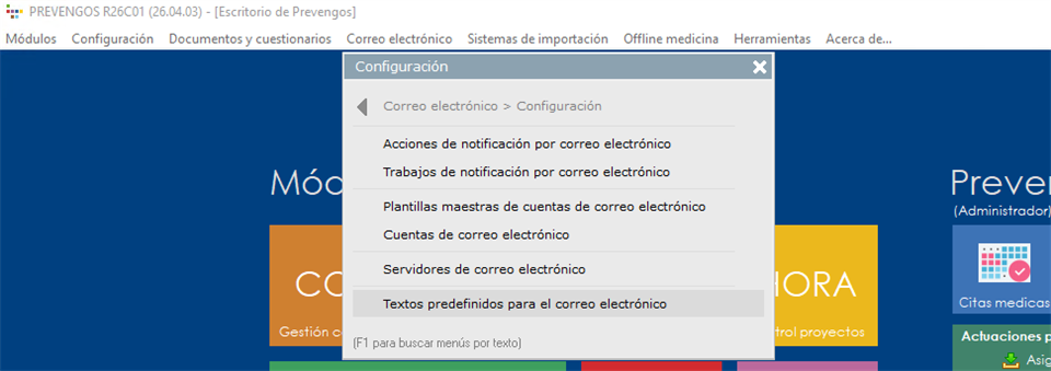 Para acceder a las configuraciones del correo electrónico, tanto de los servidores como de las cuentas de correo, tendrán que situarse en la pantalla principal de Prevengos, y desplegar el menú 'Correo electrónico' que encontrarán en la parte superior de la pantalla. Dentro de este desplegable encontrarán el submenú 'Configuración', en el cuál se cargarán las diferentes opciones de configuración del correo electrónico. En los siguientes apartados, vamos a detallar todas estas opciones por orden de relevancia.