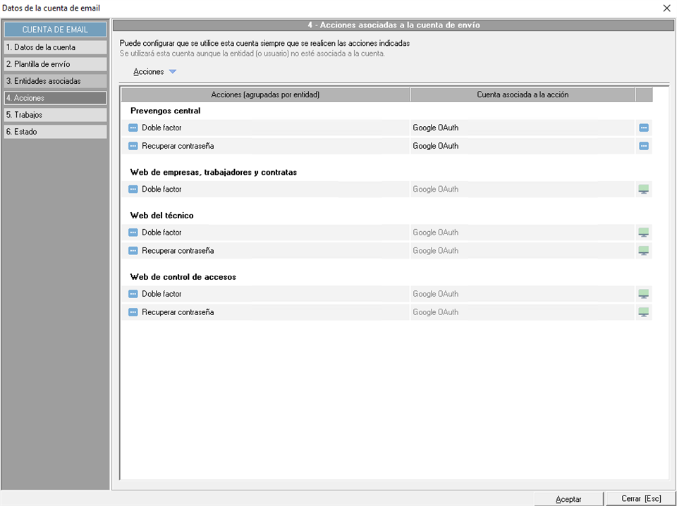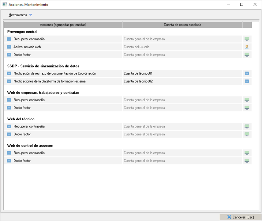 Algunas de estas acciones se pueden llevar a cabo desde Prevengos central o los distintos portales web, es decir, desde distintas entidades de sistema; tales como recuperar contraseña o email de doble factor. Por ello, se podrán configurar cuentas de correo distintas en función desde donde se ejecuten.