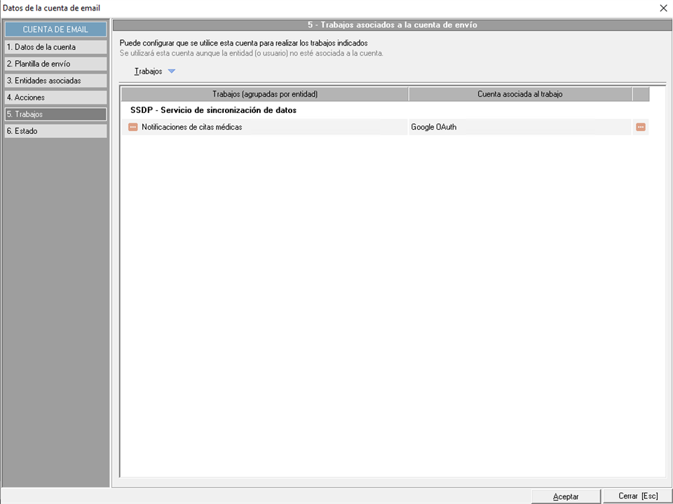 En este punto también podrá indicar si hay algun trabajo de envío de emails programados, que debe utilizar esta cuenta (notificaciones CAE, notificaciónes de agenda médica...). Para vincular trabajos a la cuenta, deberán usar el menú despletable 'Trabajos'.