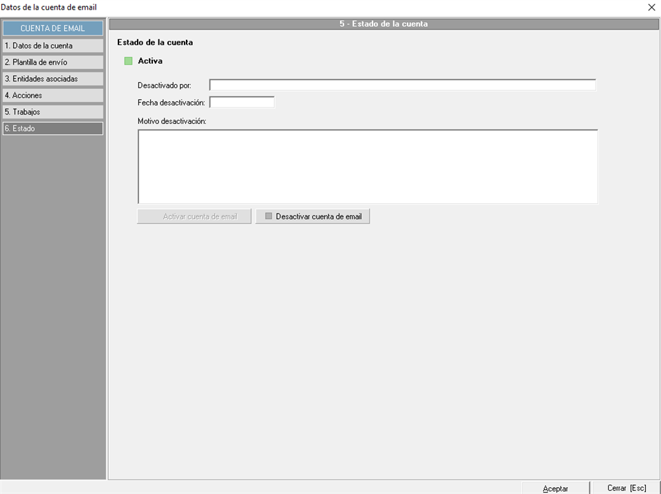 Los envíos de emails de los trabajados dependientes de las entidades relacionadas con la cuenta de correo, se enviarán a través de esta cuenta, a no ser que se especifique otra cuenta concreta directamente en el trabajo correspondiente.
