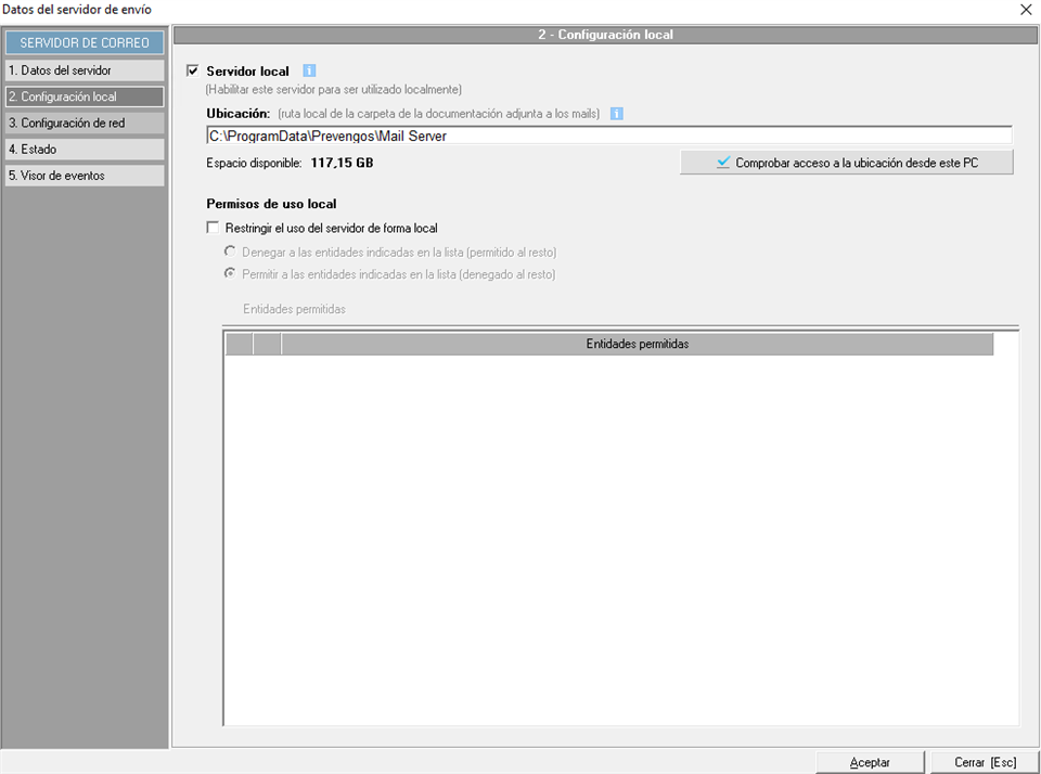En la parte inferior, podrán indicar si se va a restringir o permitir el uso del servidor para las entidades que considere. Si un usuario abre Prevengos en ese equipo, y no tiene permiso para usar ese servidor de correo, no podrá enviar emails, a no ser que tenga permitido el uso de un servidor compartido instalado en otra máquina.